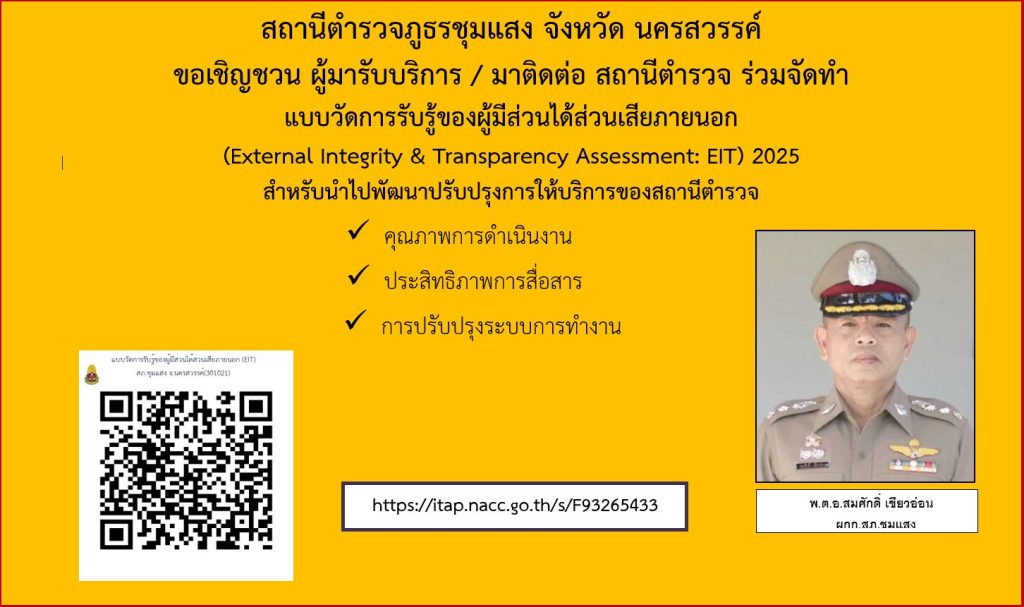 สถานีตำรวจภูธรชุมแสง                                                                    ขอเชิญผู้มารับบริการร่วมประเมินคุณธรรมและความโปร่งใส